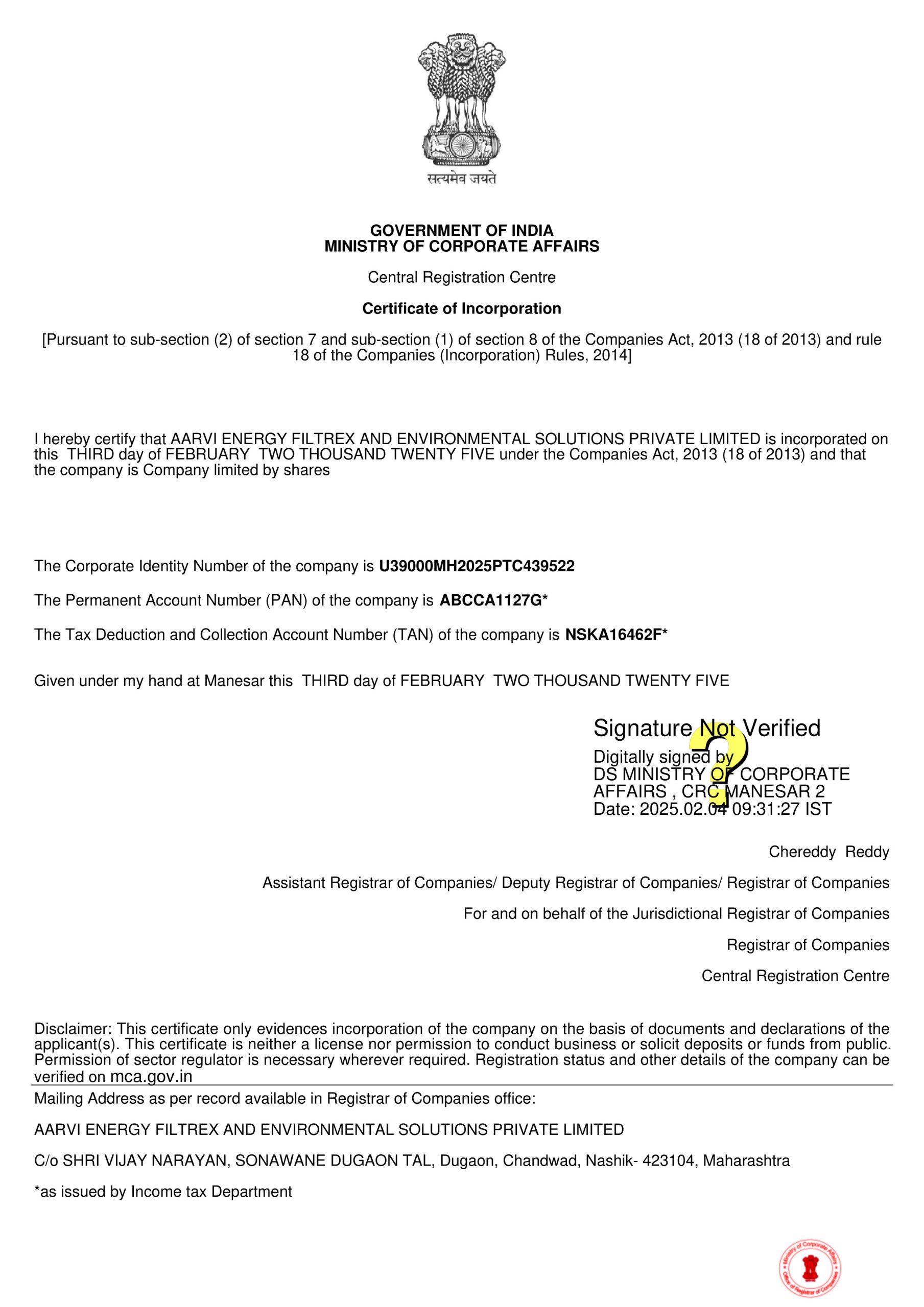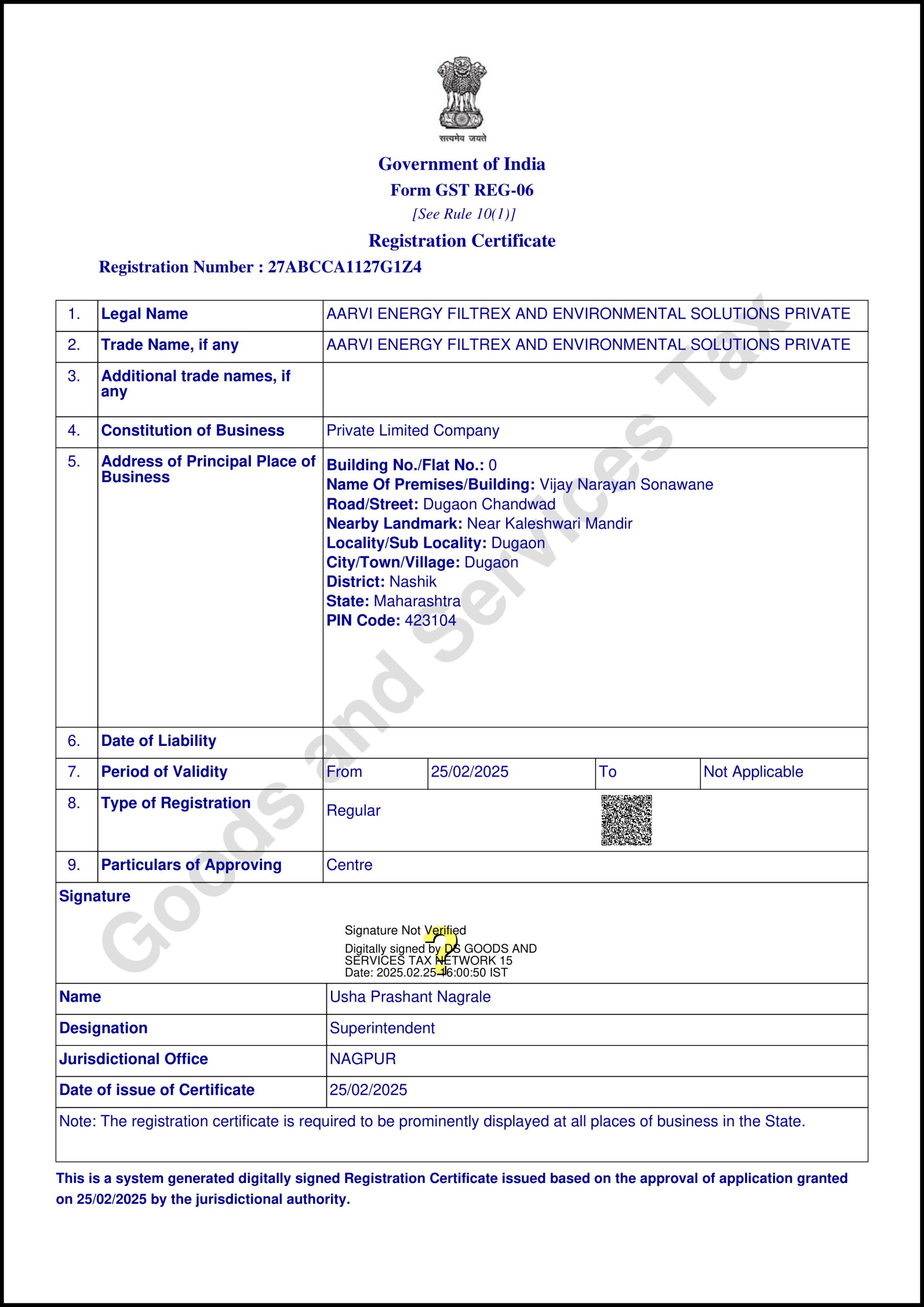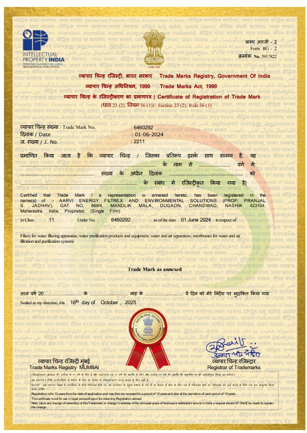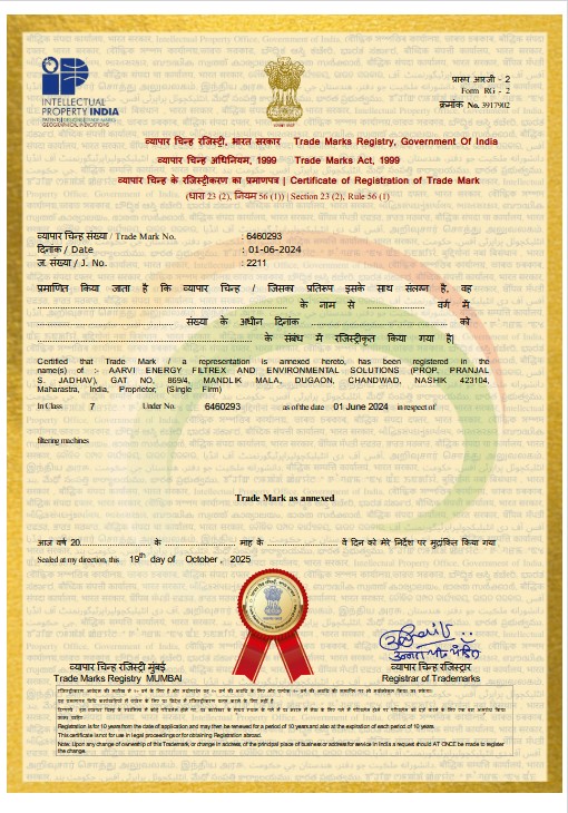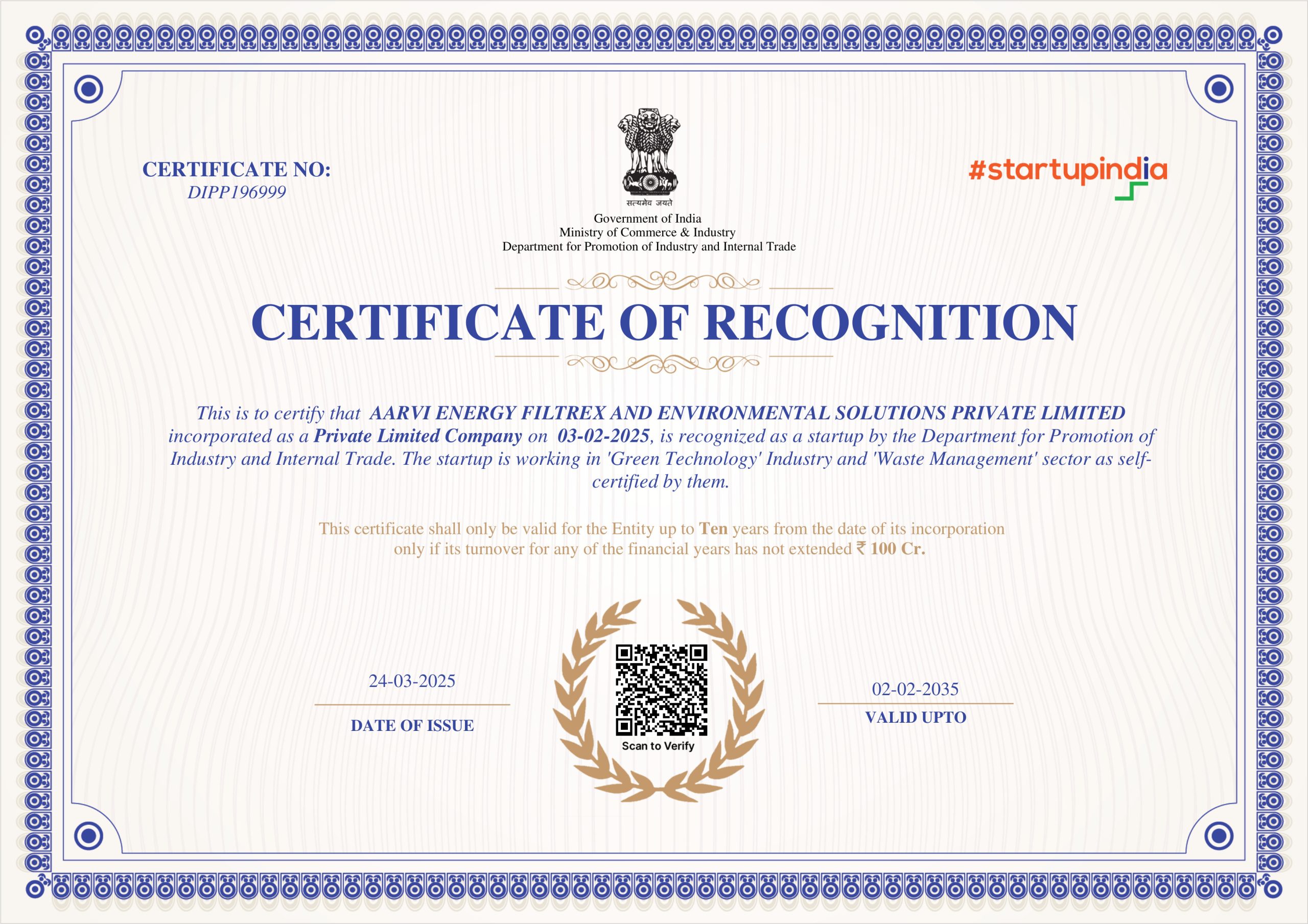 New Technology Developed by Aarvi Energy | Phone: (+91) 92846 76378 | Email: info@aarvienergy.com AARVI ENERGY FILTREX & ENVIRONMENTAL SOLUTIONS PRIVATE LIMITEDEmpowering Sustainability: Energize, Purify, Preserve Get In Touch Trademark: Class 7 Trademark: Class 11 Startup Certificate Company Incorporation Certificate GST Certificate Udyam Registration Certificate Our CLIENTS View More